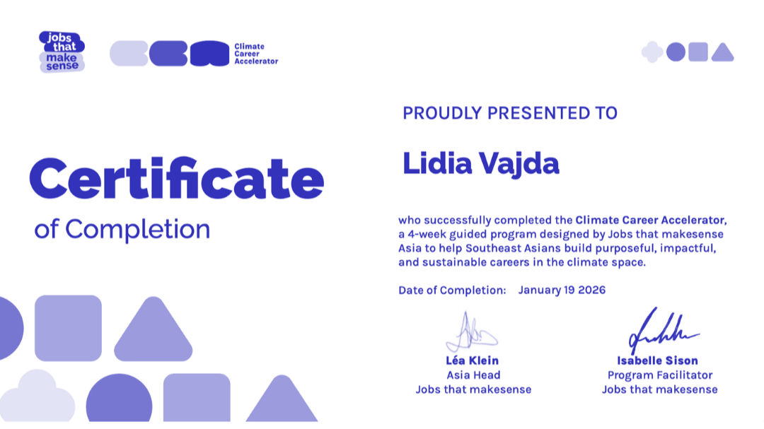 I completed the Climate Career Accelerator by Jobs That Make Sense Asia, where I gained a practical understanding of the climate sector and how to transition into impact-driven roles. The program focused on mapping existing skills to real opportunities in sustainability, with insights into emerging roles, hiring expectations, and career pathways across Southeast Asia.