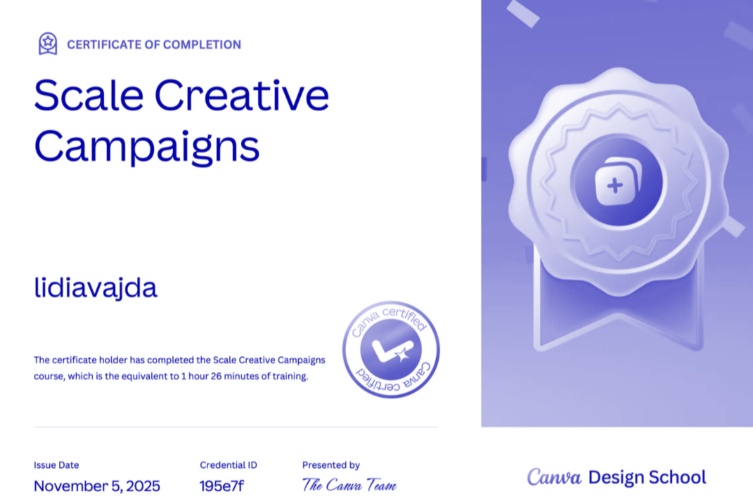 I completed the Scale Creative Campaigns course by Canva Design School, where I developed practical skills in digital marketing, branding, and content creation. The course focused on turning a single idea into cohesive, multi-platform campaigns, using customisable templates and efficient workflows to scale creative output while maintaining strong brand consistency.