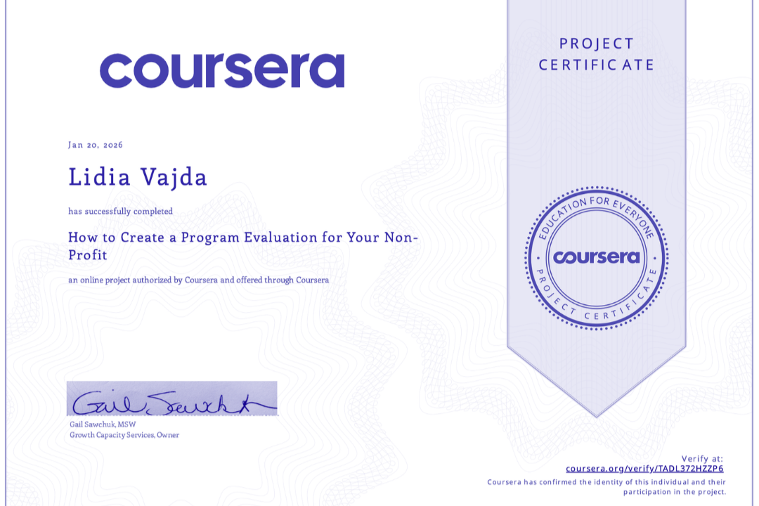 I completed the Program Evaluation for Non-Profits course, where I built foundational skills in evaluating the impact and effectiveness of social programs. I learned how to design structured evaluation frameworks, including developing logic models, setting SMART goals, and defining meaningful success metrics.